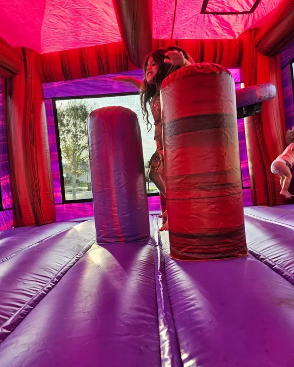 This vibrant and exciting bounce house is perfect for birthdays parties or any special occasion. With its eye-catching red and purple design it's sure to capture the attention of children and create lasting memories.